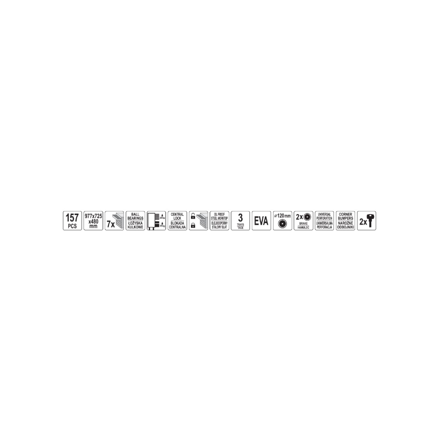 Tri od ukupno sedam fioka sadrže 157 alata smeštenih u precizno oblikovane EVA umeke, što omogućava brzu identifikaciju i urednost.
