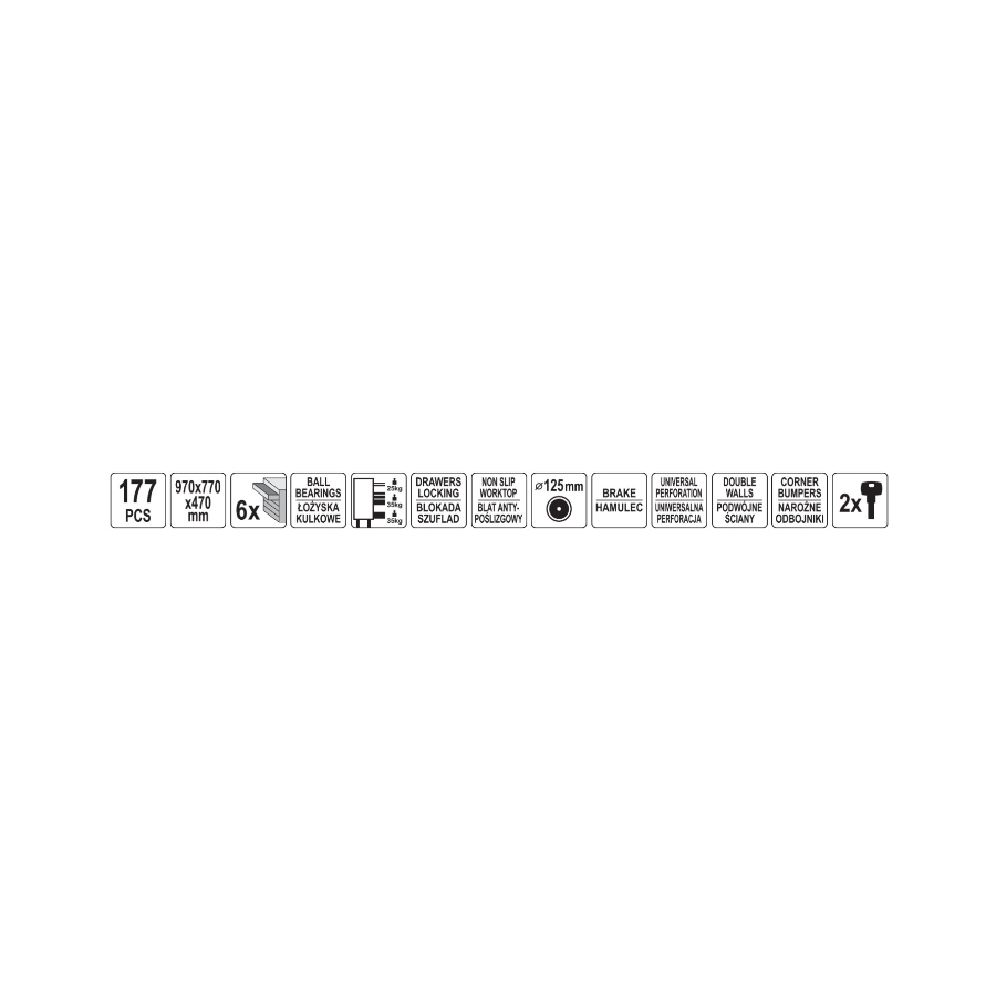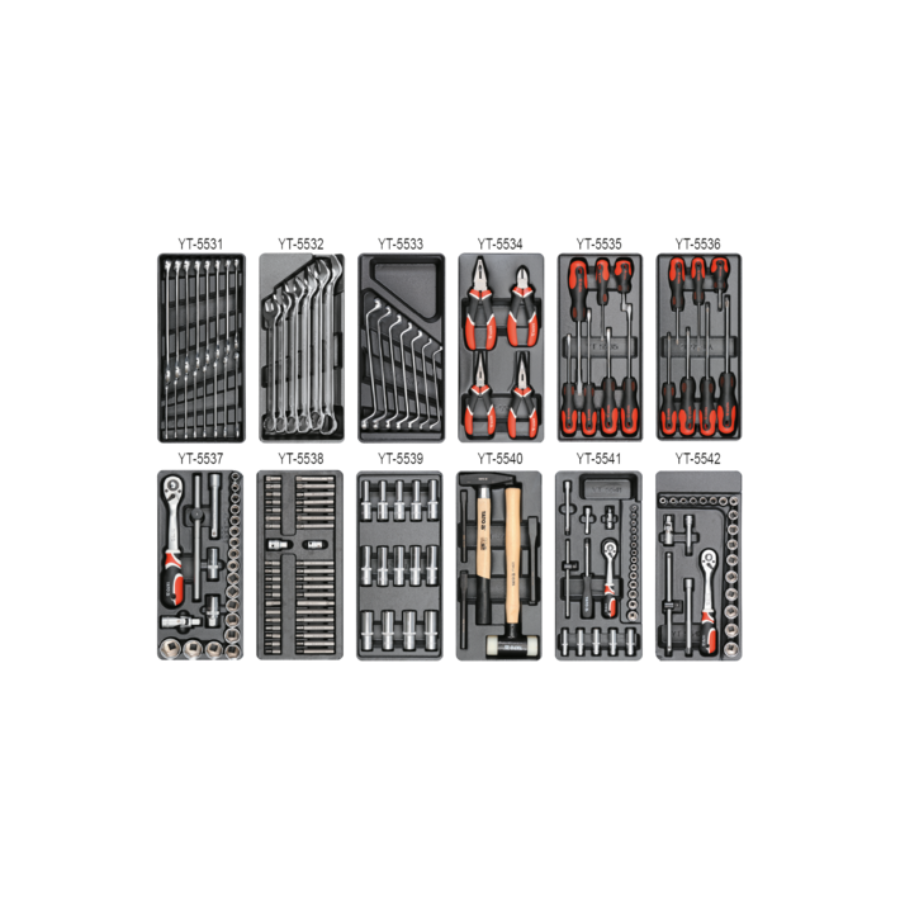 Ukupno 177 alata raspoređenih u 12 funkcionalnih kaseta, uključujući: • Nasadne ključeve 1/2", 3/8", 1/4" • Račne, produžetke, kardanske zglobove • Kombinovane i savijene ključeve • Čekiće, sekače, odvijačke nastavke i ključeve za svećice • Dugi nasadni ključevi, T-drške, nastavci HEX, TORX, SPLINE
